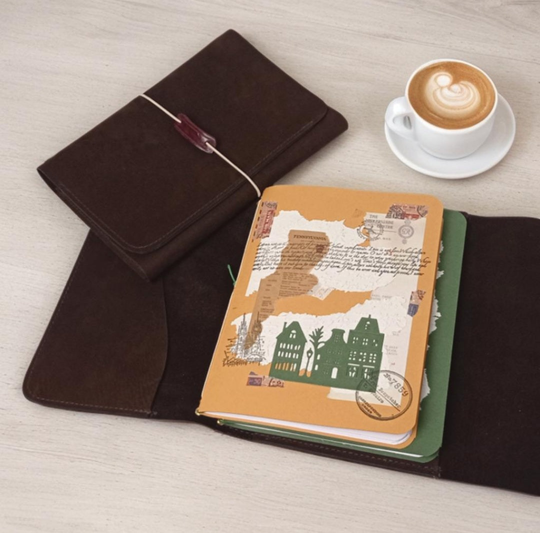 📖 Esta encuadernación es el resultado de la colaboración entre manolocremallera y Trama Atelier : una portada en piel con sistema de bandas que permite incorporar cuadernillos intercambiables, dos sobres también en piel y cuadernillos cosidos a mano , intervenidos con scrapbooking .
